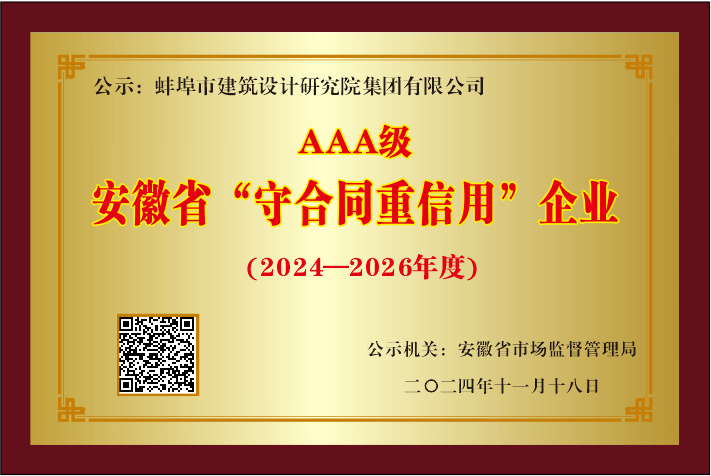 2024年11月18日,蚌埠市建筑設(shè)計(jì)研究院集團(tuán)有限公司榮獲安徽省AAA級(jí)“守合同重信用”企業(yè)稱號(hào)。