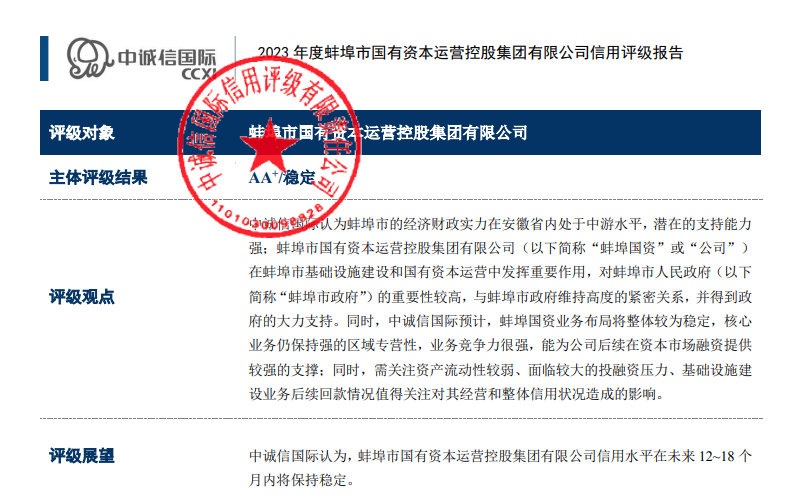 2023年94日,經(jīng)中誠信國際信用評級有限公司評定,蚌埠市國有資本運營控股集團有限公司再次成功獲評AA+主體信用評級,評級展望為穩(wěn)定,時效期為一年。這是蚌埠國控集團繼202285日獲得東方金誠國際信用評估有限公司評定的AA+主體信用評級后,再次評為AA+級信用主體,實現(xiàn)了AA+主體信用“雙評級”。